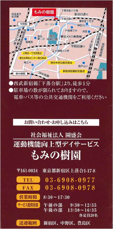 リハビリデイサービス. nagomi新宿落合店. 許認可事項: 東京都知事指定 介護保険事業所番号 1370404079 〒161-0034 東京都新宿区上落合2-8-12, nagomi新宿落合店外観. 03-3367-6388 03-3367-6389. お問い合わせ担当:平賀. 9:00~12:15 |